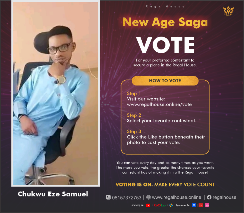 Chukwu Samuel I’m Chukwu Eze Samuel and I’m excited to announce my aspiration to become one of Regal house mate! Your votes will make me one of the Regal House mates. ❤️ Like Usage: 0/20 Likes: ️ Show Likes