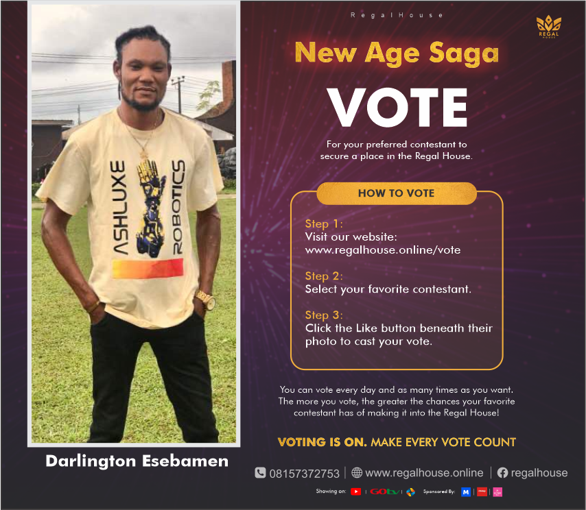 Darlington Esebamen I’m Darlington Esebamen and I’m excited to announce my aspiration to become one of Regal house mate! Your votes will make me one of the Regal House mates. ❤️ Like Usage: 0/20 Likes: ️ Show Likes