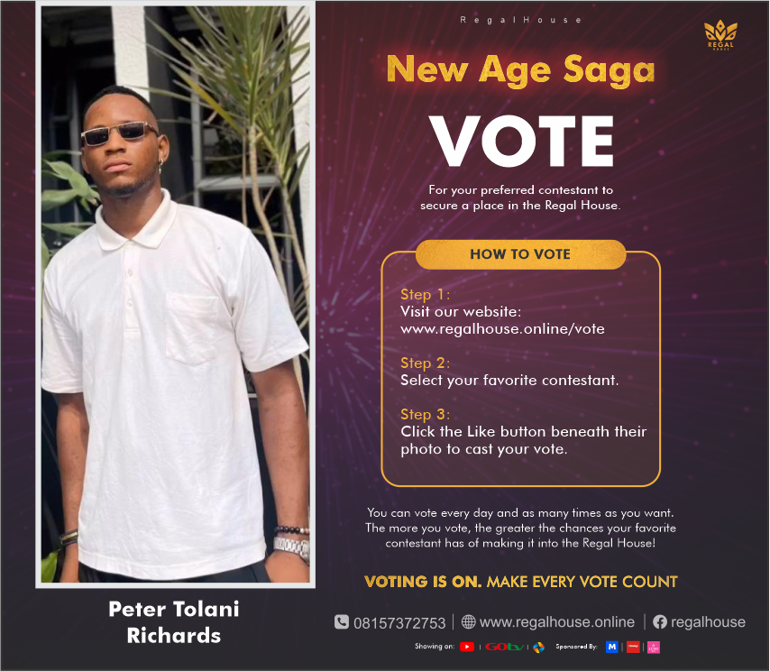 Peter Tolani I’m Peter Tolani Richards and I’m excited to announce my aspiration to become one of Regal house mate! Your votes will make me one of the Regal House mates. ❤️ Like Usage: 0/20 Likes: ️ Show Likes