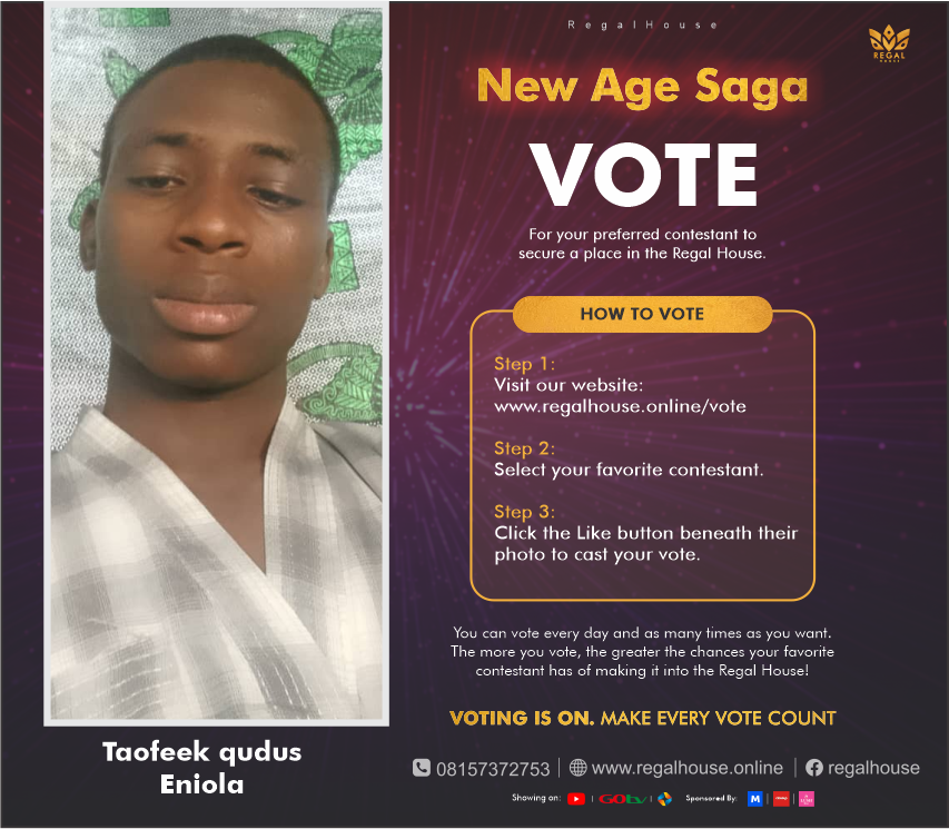 Taofeek Eniola I’m Taofeek qudus Eniola and I’m excited to announce my aspiration to become one of Regal house mate! Your votes will make me one of the Regal House mates. ❤️ Like Usage: 0/20 Likes: ️ Show Likes