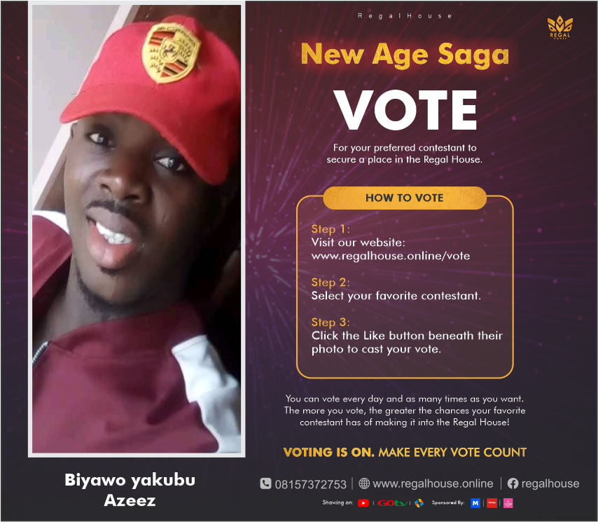 Yakubu Azeez I’m Biyawo yakubu Azeez and I’m excited to announce my aspiration to become one of Regal house mate! Your votes will make me one of the Regal House mates. ❤️ Like Usage: 0/20 Likes: ️ Show Likes